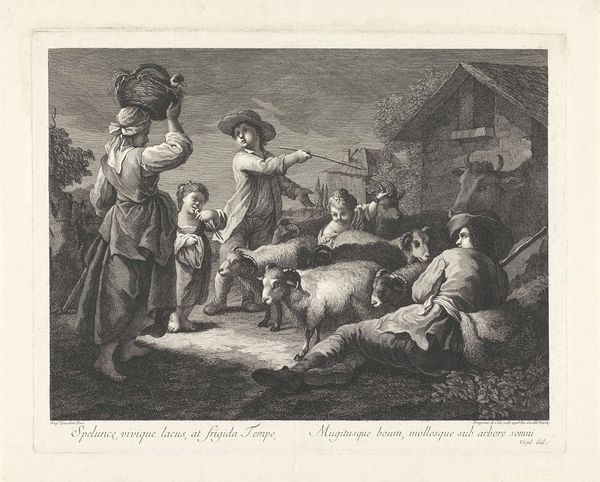 This image, "Herdersfamilie in gesprek met een boerin," was made by Pellegrino dal Colle around the late 18th century, using the intaglio printmaking technique of etching. Etching involves covering a metal plate with a waxy, acid-resistant layer, then scratching through this layer to expose the metal. When acid is applied, it bites into the exposed lines, creating an image that can be inked and printed. The fine lines and detailed shading we see here are characteristic of this process. The appeal of etching, relative to other printmaking techniques like engraving, was that it allowed for a more gestural approach. Artists could sketch directly onto the plate. The resulting prints, which could be multiplied and distributed widely, played a crucial role in disseminating images and ideas during the Enlightenment. This one offers an idealized vision of rural life, but the very fact of its manufacture reminds us of a growing urban, consumer culture.