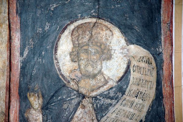 This fresco was painted by Lo Scheggia, in the Church of San Lorenzo in San Giovanni Valdarno, Italy, during the early to mid-1400s. Religious institutions such as the church were the primary patrons of art during the Early Renaissance. This is evident from the way the artist has painted this figure of a saint, as well as the other figures in the church. This painting, like others of its time, follows specific conventions to signal the religious status of the subject. The halo, for example, symbolizes the saint's divinity, the book is a sign of learning, and the walking stick indicates pilgrimage. Frescoes such as these were designed to instill specific religious values in those who viewed them. In this context, the arts were consciously put to work in the service of social power. If you'd like to understand this work better, I suggest that you research the economy of patronage during the Renaissance, as well as the history of artistic institutions, and religious symbolism of the period. Ultimately, art is most meaningful when considered in its social and institutional context.