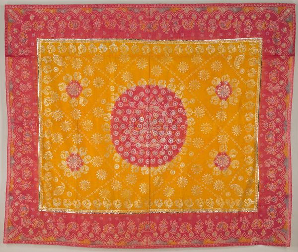 Curator: This textile work, an anonymous "Shawl" from around the mid-19th century, just vibrates, doesn't it? Look at how the patterns create movement. Editor: It does feel like the visual equivalent of a very polite dance. The intricate paisley and floral motifs create a soothing rhythm. Almost meditative, in a way. But there is a tension. I keep wondering who made this, under what conditions, and for whom? Curator: Oh, exactly! These swirling vegetal designs feel somehow contained by the rigid geometric framework around the border. To think, someone, maybe many someones, painstakingly brought these patterns to life on fabric. Editor: Yes, and within that craftsmanship are layers of historical implications. Textiles of this era were often products of colonial trade. The patterns may look purely decorative, but they carry with them narratives of global exchange, appropriation, and power dynamics. I mean, how does a "geometric" and "organic" pattern arise within those spaces? What work does that do? Curator: It's quite the rabbit hole, isn't it? Though I prefer to think about its ability to provide warmth. Shawls like this had a deep history of utility – swaddling, carrying, concealing – which speaks to different notions of privacy or intimacy that perhaps we can never quite fathom. Editor: The material life of the shawl absolutely inflects its symbolic value! The warmth, the intimacy – all tied to class and access. Was it for warmth? Display? A means of signaling one's status? The abundance of the Pattern and Decoration movement could speak to any of that! Curator: Precisely! It reminds me of an embrace that's faded over time. Like a whispered secret still clinging to the threads. Editor: More like a declaration of both individual artistry and a quiet symptom of a complex socio-economic landscape. Curator: Well, I find the dialogue itself is where its richness lies, don't you think? Editor: Absolutely. This shawl invites us to consider what we drape ourselves in, both literally and figuratively. What histories are we carrying with us, knowingly or not?