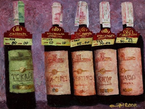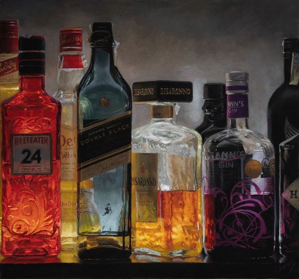 Curator: This is "Wines of Crimea," an oil on canvas created by Alexander Roitburd in 2008. Editor: My first impression is the materiality – you can almost feel the thick, impasto strokes. The composition is arresting, those grouped bottles in varying greens and reds. There's an immediate tension between the realism and a more expressive painting style. Curator: Roitburd was a prominent figure in the Ukrainian art scene, and this painting provides an interesting commentary on Crimea, a region fraught with political tension, particularly around the time this was painted. Presenting a row of Crimean wines is inherently political, claiming a cultural product tied to a contested place. Editor: Politically charged still life; fascinating! Focusing on the formal elements, observe how the bottles are slightly varied, and no two have exactly the same reflection or weight. They are individuals, though united by format and, of course, content. The dark background amplifies this almost spotlight effect. Curator: Absolutely. Roitburd’s choice of wines bottled by "Massandra," the famous Crimean winery established in the late 19th century under Tsar Nicholas II, speaks to the intertwined histories of Russia and Ukraine. This winery represents a symbol of Crimean heritage. By painting it, Roitburd engages with questions of ownership, cultural identity, and post-Soviet nostalgia. Editor: And the artist’s realism heightens that sense of palpable tension. I want to say, as a formalist, there’s so much here just in the textured light on glass. He seems less concerned with the objectness of these bottles and more interested in color modulation, tone, texture; the sensual experience. Curator: That's very astute. While celebrating Crimea, Roitburd invites viewers to reflect on its complicated history and geopolitical positioning. In many ways this canvas is an artifact reflecting regional ambitions through everyday, consumable commodities. Editor: It’s always satisfying to see the intersections of art and history converge in such interesting ways, isn’t it? It's really been illuminating exploring the deeper meaning beneath the visual elements in this painting. Curator: Agreed. It enriches our understanding.