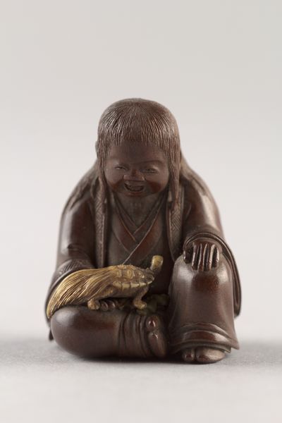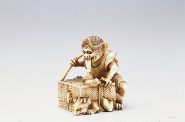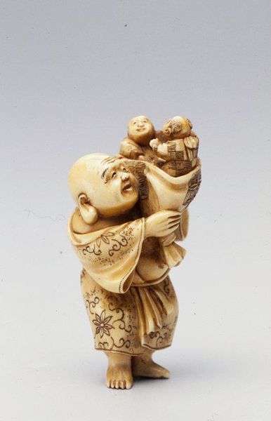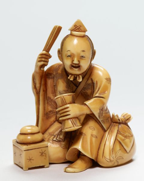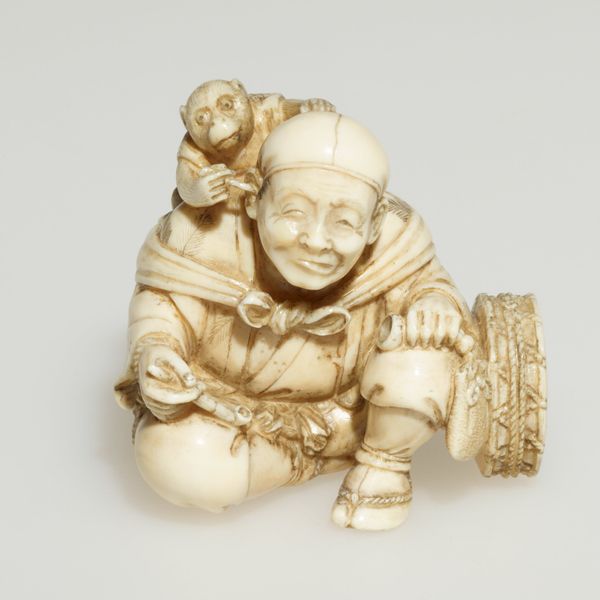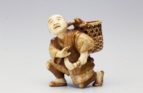 This is a netsuke of a man holding a Tai fish, made by Ryumin, and currently held at the Minneapolis Institute of Art. The piece presents us with an interplay of textures and forms. The smooth, rounded surfaces of the man’s head and the fish’s body contrast with the intricately carved details of the scales and the man’s clothing. This contrast invites the viewer to experience the artwork through both sight and touch. The composition is dominated by circular and oval shapes, creating a sense of harmony and balance. The man’s posture and the way he holds the fish suggest a sense of pride and accomplishment. The choice of ivory as a medium is significant, as it adds to the piece’s tactile quality and luminosity. Ivory is dense, therefore allows for fine carving and the creation of intricate details, as well as a durable object. The structure of the netsuke, with its careful attention to detail and balanced composition, creates a sense of order. This order reflects the cultural values of the time. It is a visual expression of the artist’s understanding of form and space.