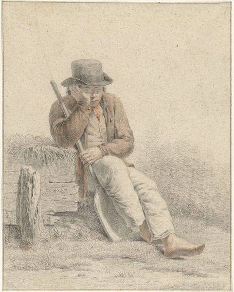 Editor: Here we have Pieter van Loon's "Sitting Smoking Man," which was made sometime between 1811 and 1873. It’s a drawing, made with pen and ink and other drawing mediums. I find the tones quite muted; it evokes a sense of quiet contemplation. What do you see in this piece? Curator: What immediately strikes me is the careful arrangement of tonal values, how the artist models the form through subtle gradations of light and shadow. Consider the geometric structure inherent in the composition. The subject is framed by largely straight vertical and horizontal lines from the architecture. Van Loon has meticulously created depth and form utilizing the limited palette. Note how the figure's posture, subtly slumped, creates a sense of melancholic weight, echoed by the downward directionality of the lines and the shadowed areas. Do you perceive how this structural organization emphasizes the quiet interiority of the figure? Editor: Yes, I do, now that you point it out. I initially focused on the subject matter. Curator: Indeed, while the subject provides a point of entry, it's the artist's deployment of formal elements—line, tone, and composition—that constructs the image's meaning and emotional resonance. Van Loon has achieved great detail in the texture through very thin lines that overlay large planes, making the textures come forward to meet the eye. Editor: I understand. So, it’s less about what the man *is* doing, and more about how Van Loon used his technique to suggest a mood? Curator: Precisely. The smoking man, as a subject, becomes a vehicle for exploring artistic form. Editor: I'll definitely look closer at the use of lines in the future. Curator: Understanding form unlocks richer interpretations and, conversely, opens our understanding of cultural context.