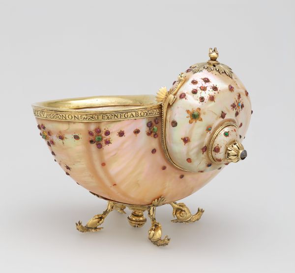Elkington & Co. crafted this Nautilus shell cup with cover, a testament to the Victorian fascination with naturalia transformed into objects of art. The eye is immediately drawn to the interplay between the lustrous, creamy shell and the intricately worked, gilded metal that forms the bird's body and base. The composition here is intriguing. The smooth, organic curves of the nautilus provide a stark contrast to the textured, almost baroque detailing of the gold. The shell, in its original form, speaks of the ocean's depths, a creation of nature. Yet, when combined with the bird form, it creates a striking tension. The gilded metal, with its detailed feathers and ornate base, could be seen as an attempt to impose order and human artistry onto the shell's natural form. This tension destabilizes the established categories between the natural and the artificial, questioning where one begins and the other ends. It invites us to ponder the Victorian era’s broader philosophical concerns about nature, artifice, and the human desire to classify and control the natural world.