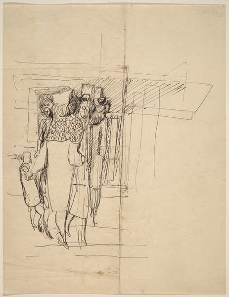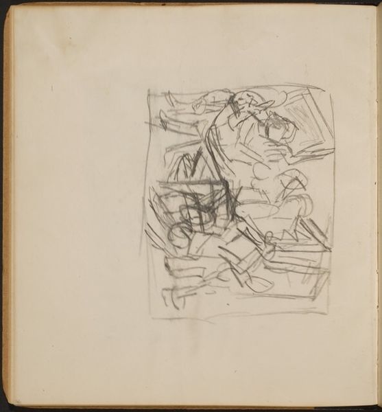 Editor: This is "Interieur mit Figuren (Figures in an Interior)", a pen and ink drawing by Max Beckmann, possibly from his sketchbook. It feels really raw and immediate. There's a real sense of movement in the lines. What catches your eye in terms of its formal qualities? Curator: Immediately, I'm drawn to the interplay of line and space. Note how Beckmann uses densely packed, angular strokes to define the figures and interior. Consider the spatial relationships; they appear compressed, almost claustrophobic. Do you perceive any deliberate structural choices in the composition? Editor: I think so, the composition is restricted within a rectangular space of the sketchbook page, the lines seem to want to break out from this container, to spill over or create new layers, which is contained instead. Does the medium of ink have something to do with the sketch? Curator: Precisely. The starkness of the ink heightens the sense of contrast, and immediacy as you've stated earlier. Observe how areas of intense hatching create depth and shadow. This is clearly an Expressionist exploration of form, not necessarily focused on realistic representation. Are you picking up on that element in this work? Editor: I can see the distorted figures now, in addition to the emotional, perhaps anxiety-driven element within the strokes. There seems to be both a chaotic jumble, and careful composition going on here. Curator: Excellent observation! The dynamism results from this very tension. Consider the composition: how would it differ were the linework more flowing, less jagged? This artist masterfully manipulated limited materials and space into a statement. What is your assessment overall, now? Editor: I appreciate how a simple sketch reveals so much about form, and how its constraints add impact. Looking at the art’s structure in itself clarified things a great deal, in terms of its construction! Curator: Indeed, analyzing the visual syntax yields valuable insight. Every stroke serves the compositional and emotional imperative of the work, nothing feels accidental.