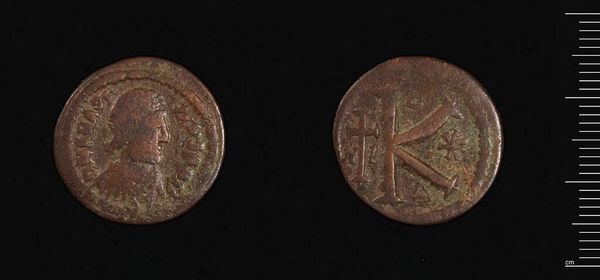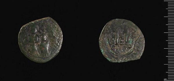 Curator: This Anonymous Follis from the Harvard Art Museums, weighing just over 14 grams, presents such fascinating insights into Byzantine currency. The materiality speaks to its daily use. Editor: It looks almost worn smooth, yet the images remain legible. You can still make out a central figure on one side. Curator: Yes, it features an image of Christ. The other side bears a Greek inscription identifying him as "King of Kings." We must remember that even mundane objects like coins were deeply embedded in religious and political messaging. Editor: Absolutely. The coin highlights that the Byzantine rulers wanted to convey that their power came from divine authority, and these messages are being circulated among the public. Curator: Considering the coin's small size, it is amazing the level of details it contains, and how well it reflects the interplay of politics, religion, and commerce. Editor: It’s remarkable how this object is a conduit into a complex world.