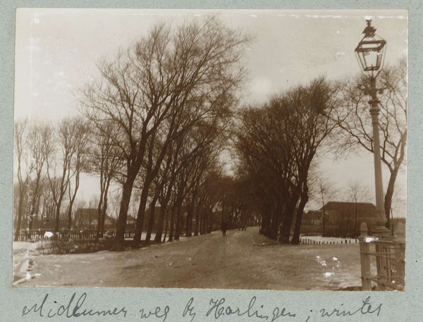 Curator: This is "Man en een vrouw wandelend op een weg met bomen bij een windmolen" by Folkert Idzes de Jong, taken sometime between 1905 and 1907. It's a photograph that captures a rural scene in sepia tones. Editor: It's evocative. The almost monochrome palette gives it a slightly melancholic, timeless feel. The composition leads my eye straight down that road. Curator: The material reality of photography is crucial here. Consider the collodion process likely used at the time; the delicate balance of chemicals, exposure time, and the artist’s hand in creating the print. This photograph wasn't merely a snapshot; it was a labor-intensive creation. And look at the subject - how windmills at this time were harnessed power shaping the Dutch landscape itself. Editor: Absolutely, the tonality emphasizes those contrasts, right? Note how the strong verticality of the trees intersects with the horizontality of the road. The light seems almost evenly distributed, with just a hint of falloff towards the vanishing point. Curator: Precisely! This reflects a broader social context. The presence of the figures on the road also offers insights. How the road is a mode of production to the characters shown and how society engages with travel. They show not just people moving through the space, but also class and the access and restriction surrounding travel and space in society. Editor: True, and formally speaking, it is striking how de Jong captures the bare branches, almost like ink strokes, against the sky. Also how light and shadow give form to the windmills. The details speak of a careful consideration to depth and surface texture, despite the technological constrictions. Curator: Thinking about material limitations, you begin to interpret how the photo embodies accessibility in the arts for middle-class men such as De Jong, due to technology development in media. Editor: Indeed, looking closely, it’s that interplay of the natural, captured in such a manufactured tone, along the constructed windmill as both merge in that long shot down the open path that is intriguing, which speaks to the dynamism the artwork shows between subject matter and execution. Curator: Exactly. The social context, together with those material processes and constrictions is what shapes it into a relevant document and aesthetic expression, rather than simply an "image." Editor: A good reminder of how technology meets form.