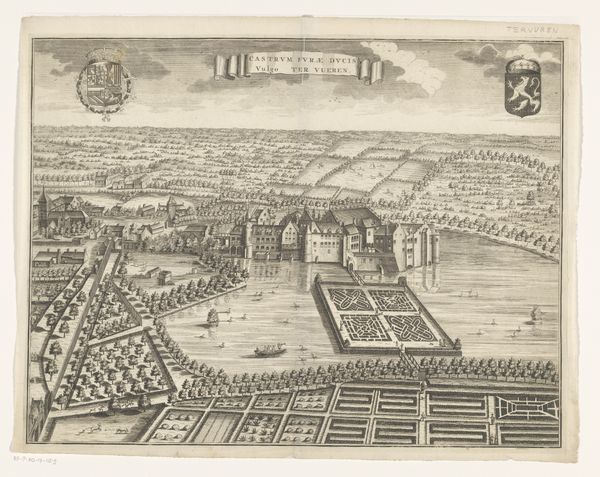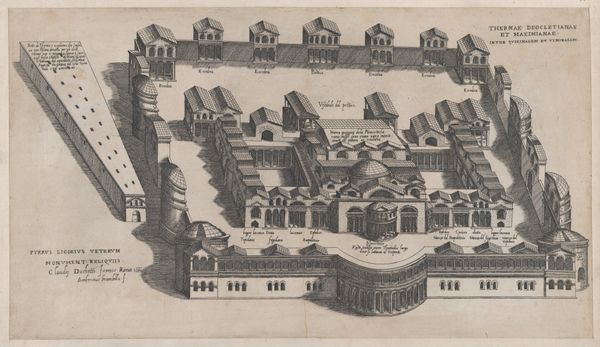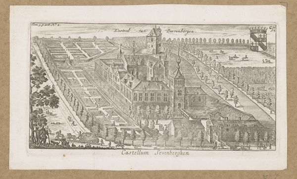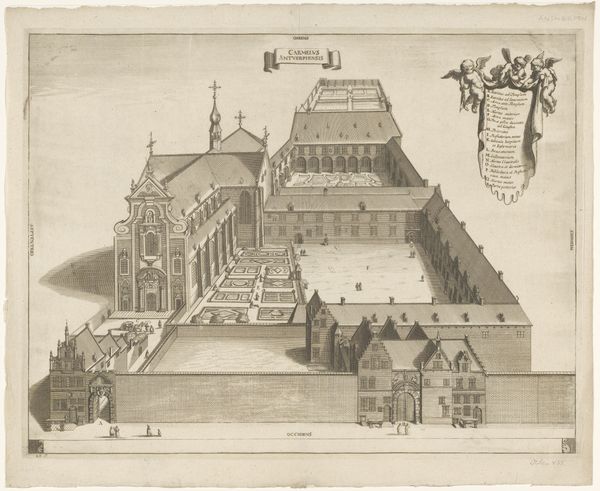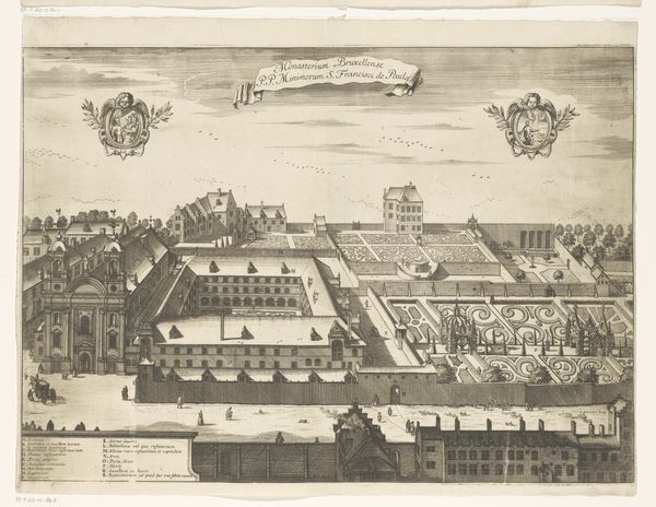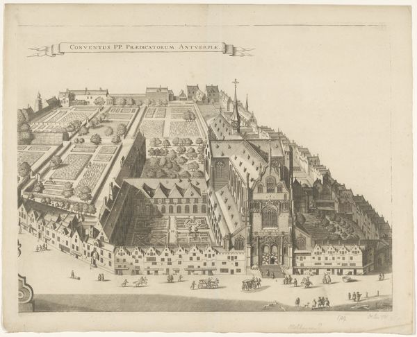 Curator: Here we have an intriguing cityscape from the early 18th century, "View of the Augustinian Monastery in Antwerp," likely dating from between 1727 and 1734. This engraving offers us a bird's-eye perspective of the monastery complex, rendered with a precision that invites close inspection. Editor: My first impression is how rigidly organized everything appears. From the manicured gardens to the regimented rows of houses, it feels like a very controlled environment, reflecting a particular social order. There's an air of solemnity, perhaps even constraint. Curator: That sense of control is fascinating because Baroque cityscapes, especially those depicting religious institutions, were often deliberately designed to project power and stability. The formal gardens and the imposing architecture visually reinforced the Church's authority and permanence. Also, see how the walled garden contrasts with the exterior buildings, reinforcing themes of purity, contemplation, and, arguably, isolation. Editor: Absolutely. The visual message here seems quite deliberate, an attempt to present the monastery as a pillar of the community. But, to whom was that image targeted, I wonder? Given its elevated perspective, this image would have been visible to only the highest authorities. Was this to celebrate accomplishments or mask vulnerabilities within the religious establishment? Also, there's something about the way the perspective is flattened, creating a feeling of detachment from street-level life. What is absent is as telling as what is included in the print. Curator: That’s a crucial point. We are missing, for example, any visible human expression in the scene; this makes one ponder, what message is being communicated? While it portrays the structure, it also serves as an emblematic portrait, imbuing it with the values and ideas of its time. Look how that emphasis reflects a desire to express institutional values through symbolic architectural design, a common technique in the Baroque era. Editor: Thinking about its cultural context helps unpack deeper implications embedded in this piece, and it becomes a kind of mirror reflecting the sociopolitical hierarchies. Its power is still here, centuries after its creation. Curator: Indeed. These works carry layers of visual and historical resonance far beyond their initial intent, as objects or aesthetic devices. Editor: Leaving us with enduring questions about representation, ideology, and the visual language of power.