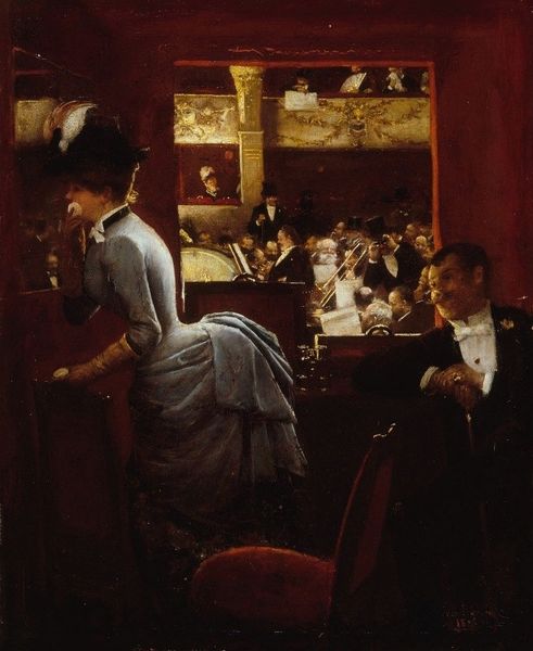 Henri Gervex's painting, "Café Scene In Paris," invites us into a snapshot of Parisian life, where the formal arrangement speaks volumes. Note how Gervex structures the scene using a series of horizontal planes - the tables, the banquettes, the picture rail - to create a sense of depth and separation between the foreground and background. The composition is carefully balanced. The figures are grouped unevenly to create a visual rhythm that keeps the eye moving, yet there is a clear sense of order. The muted palette of browns and creams unifies the scene, contributing to the overall atmosphere of bourgeois intimacy, but also suggesting the more subtle hues of social commentary. Consider how Gervex uses light and shadow to define the forms. Notice how the artist deftly captures the texture of fabric and the sheen of polished surfaces. These formal elements create a sense of realism and bring the scene to life. This interplay invites us to decode the social codes and unspoken narratives of Parisian society.