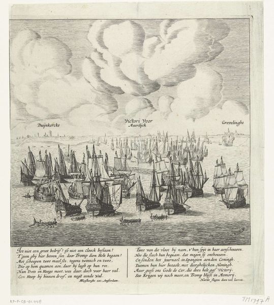Editor: This engraving, “De slag op het Slaak, 1631”, created sometime between 1651 and 1652, depicts a chaotic naval battle scene. There are so many ships crammed into the composition, and the smoke from the cannons is really intense! What sort of significance did scenes like this carry back then? Curator: This imagery presents an interesting study in how power and conflict are represented. These scenes weren’t just records; they were carefully constructed narratives meant to evoke specific emotional responses. Think of the billowing smoke. What feelings does that evoke in you? Editor: Danger, for sure! And a sense of overwhelming force, I guess. Curator: Precisely! And consider that this wasn’t simply about documenting a battle; the visual drama itself reinforces ideas of national strength, of resilience against adversaries. Note the symbols: the flags, the specific designs of the ships. These details encode identity. Editor: So it’s less about accuracy and more about…persuasion? Like propaganda, almost? Curator: Indeed. But more than propaganda, it is about cultural memory and its preservation. These symbols became shorthand, allowing viewers to connect current struggles with past glories, reinforcing national identity and continuity over time. What enduring values or anxieties do you think the artist tried to express by creating this scene in this particular style, so long after the actual event? Editor: That’s a great point about memory. Maybe they wanted to keep reminding people about the cost of freedom. Curator: A potent interpretation! It reveals how images function as powerful touchstones within a culture. Editor: Seeing the symbols as cues for collective memory gives this image a whole new depth for me. Curator: Precisely! We learn to understand an image’s many layers.