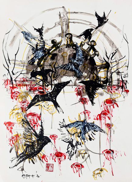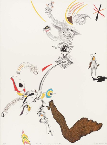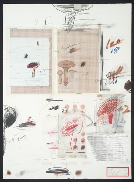Curator: My first impression is one of controlled chaos, a sort of beautiful anatomical nightmare. Editor: You're right, it's intense! What we're looking at is Vladimir Velickovic's "Elements and Documents Employed" held here at the Tate. There's no specific date assigned to it, but it’s clearly a statement. Curator: Statement is right! It feels like he's dissecting not just bodies, but ideas. Those scattered images and the obsessive linework hint at a mind grappling with something huge. Editor: Velickovic often explored themes of violence and the human condition. The red accents, the anatomical studies…it's all quite visceral. Curator: Exactly! Like raw nerves exposed. And those scissors… are they cutting ties or creating new ones? It's that ambiguity that fascinates me. Editor: Well, it certainly makes you think about the forces that shape us, doesn’t it? Curator: Absolutely. It's a powerful, unsettling piece that stays with you. Editor: Indeed. A testament to art's ability to confront us with uncomfortable truths.