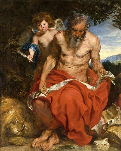 Curator: Ary Scheffer’s “The Return of the Prodigal Son,” painted in 1857, presents a poignant scene rendered in oil on canvas. The narrative, steeped in biblical lore, focuses on the moment of reconciliation. What strikes you upon viewing it? Editor: Well, first off, the palpable tension! I sense that complex brew of relief and shame, don’t you? The averted gaze, clasped hands… feels incredibly intimate. I can almost smell the old room where the return occurred, a strange combination of anticipation and the stale residue of regret, clinging to the air. Curator: Precisely. The artist's calculated use of chiaroscuro intensifies the drama. Observe how the light dramatically spotlights the faces, drawing us into their emotional landscape while obscuring details in the periphery, heightening focus on psychological elements. Editor: I see it, like a theatre stage, where light reveals all that matters: their feelings. Yet the son, it’s interesting... he’s barely clinging to the present, right? More caught up in looking above. Curator: Scheffer employs the conventions of Romanticism here, embracing emotion and subjective experience, but the figures possess the studied anatomy indicative of academic art. The narrative unfolds as portraiture, really, freezing feeling at its peak. Editor: Frozen yes! As though time stops when they look at each other after this absence. This piece brings out a thought: How we can go far and wide, making so many mistakes in the world, but the only safety remains, maybe, at home. With our beloved ones. Curator: A very perceptive reading, capturing how art can function as both mirror and window. A visual poetics. Editor: Thank you. And for me, the best kind of art helps us look at ourselves, or those we have hurt along the way, and the value of forgiveness, of coming home. Curator: Indeed, thank you. Scheffer provides the space to consider just this. The piece lingers with questions of sin, redemption, and unconditional love.