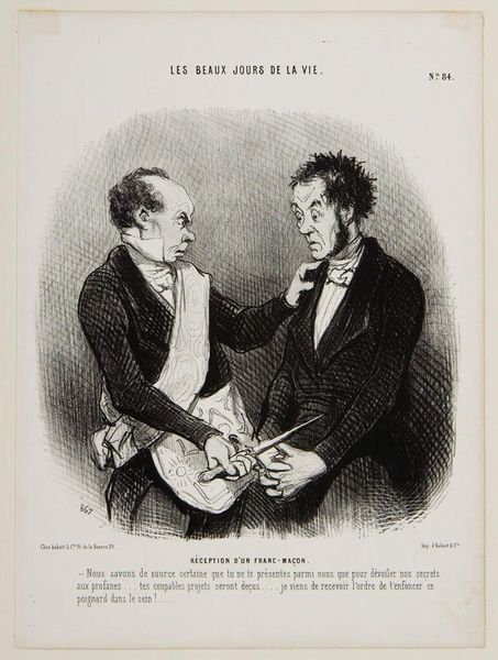 Curator: Daumier’s "Un Nouvel Anobli" captures a moment of high society awkwardness, wouldn't you say? The lithographic lines alone give such a sting. Editor: It's all about the material conditions here. Lithography allowed Daumier to cheaply reproduce and disseminate his social critiques to a wide audience. Curator: The faces, though! That startled expression—it's as if they've seen a ghost, or perhaps just the painful truth of their own pretensions. Editor: I see the means, the class system, and the satirical bite, all thanks to a specific printing method. Curator: Yes, seeing the mechanics makes the meaning much clearer, doesn't it? Editor: Absolutely, and it helps us see through the charade of it all.