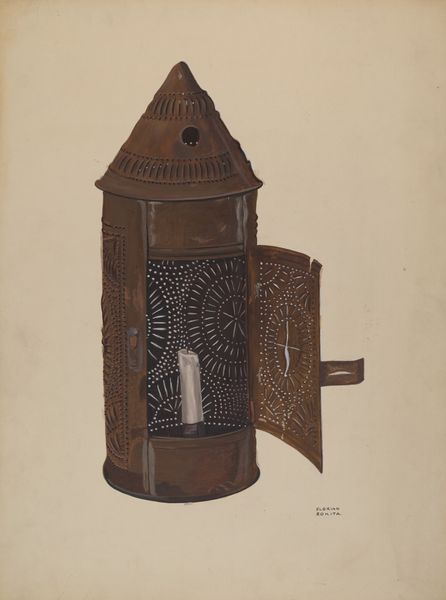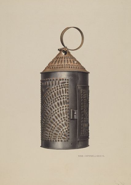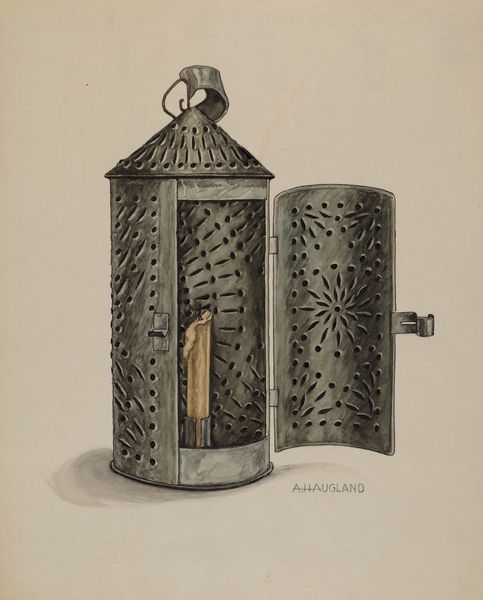 Curator: Looking at this drawing by Holger Hansen, dating from 1936, one gets the distinct feeling that light isn't just something emitted, but a fragile thing to be guarded. What’s your immediate reaction to "Lantern"? Editor: Initially, I am drawn to the piece’s overall somber, almost melancholy mood. The subtle greys and the muted texture give the piece an unassuming gravitas, as if it’s not simply portraying an object, but holding onto an almost bygone era. Curator: Absolutely, there is this whisper of holding onto a fleeting presence! Considering its strict formal lines and reliance on realism, notice how Hansen captured a world on the brink of something new using just pencil and paper. The texture, even replicated so modestly, gives the medium a surprising sturdiness that parallels the lantern's supposed function and stoic presence, really. Editor: Precisely. Semiotically, the lantern with its little decorative cut-outs does act as a fascinating signifier. One, of course, sees illumination; and this one suggests something contained and personal, perhaps symbolic of a safe retreat or solitary reflection. That partially burnt candle makes it seem as though we just walked away from a darkroom, perhaps? Curator: I hadn't thought of a darkroom connection; a fantastic thought to extend the idea of guarded illumination even further! Speaking personally, I find it easy to project something of my family history, from generations before me, into this sort of artifact. A bit spooky, and warmly inviting at once. Editor: That is indeed a perfect contrast! And yet that door—ajar as it is—allows light, yes, but also implies vulnerability or an invitation. The lantern, although rendered with realistic intent, borders a more philosophical musing on domesticity. Curator: The interplay between utility and symbolic meaning feels intentional. We look at something designed for mundane use, but instead it whispers stories of solitude and inner light. It gives weight and perspective to that "holding on" sentiment, wouldn't you say? Editor: Definitely, a convergence of what an object *is* and *could mean*. "Lantern", while technically simple, manages to emit not only depicted but suggestive illumination, far exceeding its material rendering. It is an odd kind of marvel!