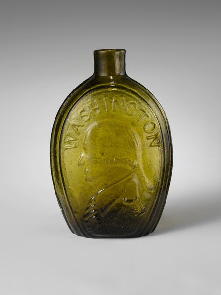 Curator: Ah, the “Flask,” produced sometime between 1833 and 1850 by the Bridgetown Glass Works. It resides here at the Met. Editor: It's such a ghostly, yet comforting green color. I get a palpable sense of history just from the way the light plays through it. What can you tell me about the subject, because the portrait almost melts into the whole. Curator: The flask showcases a molded portrait, likely of a prominent figure of the time. Portrait flasks became quite popular in the United States during the first half of the 19th century, reflecting the burgeoning national identity. Often they were designed as historical portraits, and the form clearly speaks to a Romantic aesthetic. Editor: I see that sense of burgeoning identity reflected. And I’m struck by how ordinary it appears and, and yet there is a national identity that one holds in the hand. So, was this purely celebratory? How would a flask of this sort function socially? Curator: Flasks such as these held alcohol, thus often symbolizing fellowship and perhaps clandestine meetings of patriotic citizens. Moreover, mass production enabled access for wide swathes of the population, democratizing portraiture in a new way. The portrait is stylized, archetypal. It creates an effect where you see what you want to see. Editor: That makes so much sense; the glass medium itself seems perfect for imbuing a romantic mystique to that image. It certainly creates that atmospheric remove while simultaneously feeling solid and everyday. It becomes this oddly patriotic item—like the physical vessel *of* national pride. Curator: It bridges the ideal and the accessible, something the Romantic style managed so well, a solid symbol made ethereal through glass. Thanks to that subtle portrait, this flask really embodies something greater than itself. Editor: Yes, and just look how a common glass piece can echo the broader political sentiments of its era. Amazing how objects become powerful historical witnesses.
