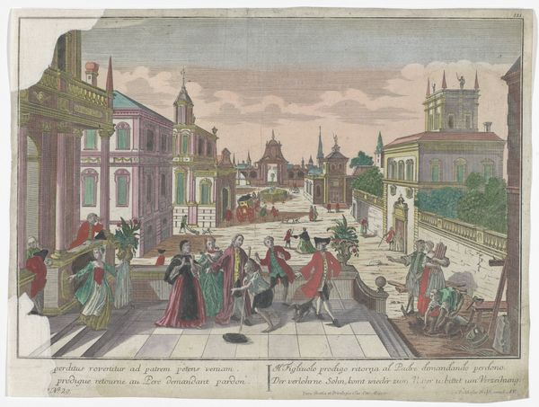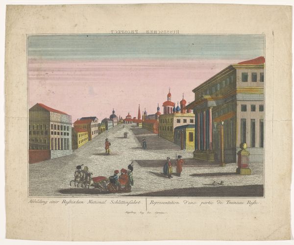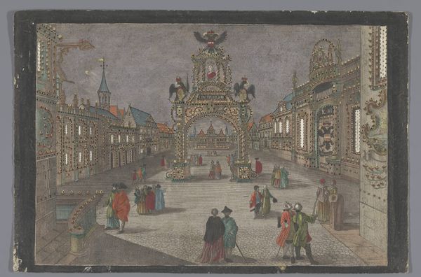 Editor: Here we have Georg Balthasar Probst’s "Gezicht op de goederenopslag te Wroclaw," made sometime between 1742 and 1801. It’s held at the Rijksmuseum. Looking at this piece, I’m struck by how intricate the buildings are and, yet, there’s almost a whimsical quality to the color palette. What stands out to you? Curator: Whimsical is a fantastic word for it! It reminds me a little of those intricately detailed architectural fantasies Piranesi conjured, but with a gentler touch. What Probst captures here, for me, is the bustle of 18th-century urban life – that feeling of controlled chaos. The perspective almost feels pulled from a stage set – don't you think? And what do you make of the almost miniature-like quality of the figures populating the scene? Editor: Absolutely! They do look like actors on a stage! And now that you mention it, the figures seem almost secondary to the architecture itself. Is Probst emphasizing the city as the main character in this scene? Curator: Precisely! Wroclaw itself, its buildings and its organized chaos, becomes the subject. This piece serves as a lovely testament to a specific time and place. And perhaps, too, it speaks to the changing face of European cities at the cusp of modernity. It's not just documentation, it's a vibe, right? Editor: Totally! I was so focused on the surface details, I missed the bigger picture. Now I’m wondering, what did people think about city life back then? I think I have a better appreciation of how detailed these artworks are now. Thanks for this perspective!