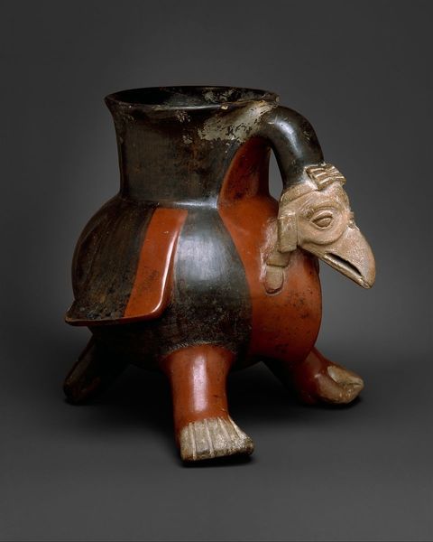 Editor: This is an ancient ceramic sculpture titled "Vessel in Form of a Head Wearing a Bird Headdress" from the Moche culture, dating back to around 100 to 500 AD. The details are fascinating; what immediately strikes me is the intensity of the figure's gaze and the powerful presence of the bird. How do we interpret a piece like this through a historical lens? Curator: This Moche vessel provides us with invaluable insights into their society and belief system. Ceramic vessels like this were not simply decorative. Considering that we do not have a written language for this culture, this kind of artwork stands in for the record-keeping we are more familiar with. Ask yourself, what stories might this portrait-vessel be telling? Editor: That's incredible. It makes me wonder, could this bird headdress symbolize something important? Curator: Precisely! The headdress could be linked to shamanic practices, or high social status. The details could even depict a specific person, or social type from Moche society. We also need to remember the function of the object itself. How does the practical usage of this artwork play into the social messaging, or its artistic interpretation? Editor: I see! The fact that it’s a functional object—a vessel—meant it had a place in everyday life and ritual. How does the vessel's practical purpose relate to the representation? Curator: Its purpose meant constant handling, and so constant engagement with the depicted subject. That suggests that imagery was carefully chosen to align with certain powers, beliefs or stories which reflect values circulating at the time. It underscores art’s vital role in communicating power structures, cultural narratives, and social identity. Editor: It is amazing to realize the kind of societal insight that we are able to deduce from just one artwork! Curator: Absolutely, the real value of these artworks appears when placed within an understanding of history and cultural studies. Hopefully this experience has enhanced your view and increased your understanding of this society!