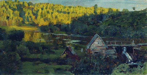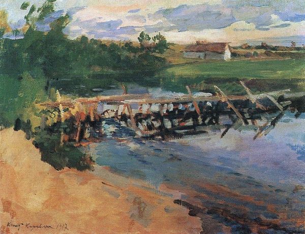 Curator: It's incredibly atmospheric. I find a sense of melancholy in the muted color palette. What do you think? Editor: This is "Pavlov's Mill on the River Yahrust," a painting made in 1905 by Boris Kustodiev. We see a quiet landscape—the titular mill on the edge of a river, all captured in oil on canvas. The brushstrokes have an almost hazy quality, wouldn't you agree? Curator: Definitely. The subdued color choices contribute significantly. I am interested in its depiction of rural Russia at a critical moment of social and political change. Mills like this weren’t simply parts of the landscape; they represented a way of life on the cusp of disappearing with industrialization and modernization. What social strata did these structures represent at this moment of flux? Editor: Precisely! And that perspective reflects the rising Post-Impressionist style, moving beyond pure impression to infuse landscapes with social context and commentary. Kustodiev, like many of his contemporaries, used art to portray and examine the realities of a changing society. It's more than just a picturesque scene, isn't it? This also considers that artistic societies—and artistic institutions—may still place great stock on traditionally conservative subjects and scenes, further reflecting how this movement negotiates Russian politics. Curator: Absolutely. Consider the title, too. "Pavlov’s Mill" centers a specific place, and thus a specific narrative tied to its location and likely to its laborers. And you have a good point. Its commitment to Post-Impressionism—while it incorporates aspects of modernism—remains invested in artistic legacy as it reckons with shifts in Russian identity and culture. I'm now wondering about issues such as ecological balance, resource ownership and, most of all, collective experience that is suggested through Kustodiev’s visual language and medium. Editor: An incisive analysis. When we view this piece, especially as members of an increasingly globalized society, we witness art acting as witness to societal transformations while the old order gives way to new paradigms. Kustodiev compels the contemporary audience to remember, rethink, and reimagine a rural life and community. Curator: So it becomes a historical document imbued with artistic vision, subtly critiquing the present by preserving a sense of the past and gesturing to the future, thus raising further discussions around how modernity can take hold on historically entrenched ways of life. Editor: A very apt way to consider it!