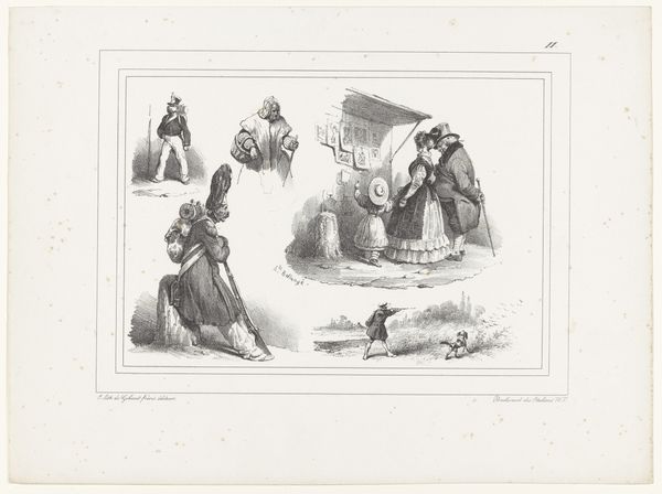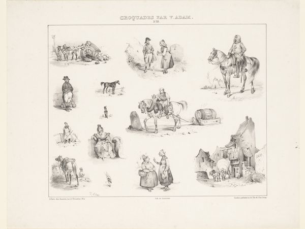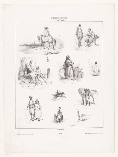 Curator: This lithograph by Victor Adam from 1837, titled "Negen voorstellingen van menselijk tijdverdrijf," which translates to "Nine representations of human pastimes", offers a fascinating snapshot of 19th-century life. It's currently held here at the Rijksmuseum. What are your initial thoughts? Editor: It feels a bit like flipping through someone's sketchbook! There's a certain charm to seeing all these figures so closely packed, a collage of humanity from a bygone era. Melancholy hangs over them. Do you get that? Curator: Absolutely! Adam was quite adept at capturing the essence of Romanticism. Though on its face, a seemingly straightforward collection of genre scenes, a careful read shows something beyond pleasant vignettes. The Romantic movement wasn’t simply about pretty landscapes, it was also about revealing deep emotions. Editor: That melancholy links directly to the changing roles, uniforms and class that Romanticism reveled in depicting, almost always in contrast with scenes from the past. Even the inclusion of those uniforms, the clear marking of hierarchy in the work, has an impact, especially when considering who gets to engage in leisurely “pastimes”. Curator: Precisely! It acts as social commentary as much as artistic endeavor. Notice the details. The posture of each figure and the expressions Adam gave them invite us to consider their social standing. In some ways, the images echo those found in the wildly popular ‘Physiognomy’ guides that sought to define types through illustration and word. Editor: And let’s not forget the power dynamics, inherent in these illustrations. The riders versus the footmen, and the apparent, casual indifference displayed, reveals social inequalities deeply rooted within these seemingly mundane activities. Curator: That contrast truly resonates. The romanticized settings serve almost as a smokescreen, don't they? Perhaps Adam intended to highlight these disparities or just represent life as it was in those moments, for those who could enjoy it at their leisure? Editor: Or perhaps he sought both— a simultaneous critique and document of his era’s paradoxes. Art's potential for multi-layered reading is truly enduring, and its significance continues to grow across time. Curator: Indeed, and Adam's "Nine Representations of Human Pastimes" is a beautiful reminder of that. I hope you have enjoyed our time reflecting on this gem today.