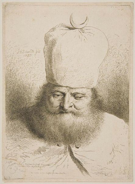 Editor: This is Rembrandt's "Bust of an Old Man with a Fur Cap and Flowing Beard," an etching. It's so tiny! What do you see in the linear construction of the piece? Curator: Note the density of the lines concentrated around the eyes and the fur cap, creating focal points. The varying pressure suggests a deliberate compositional strategy. How does this articulation of line contribute to the overall effect? Editor: It's like the details are more important than the whole. It is an interesting way to build depth. Thank you. Curator: Indeed. The expressive quality resides within these calculated arrangements, inviting contemplation on the nature of representation itself.
