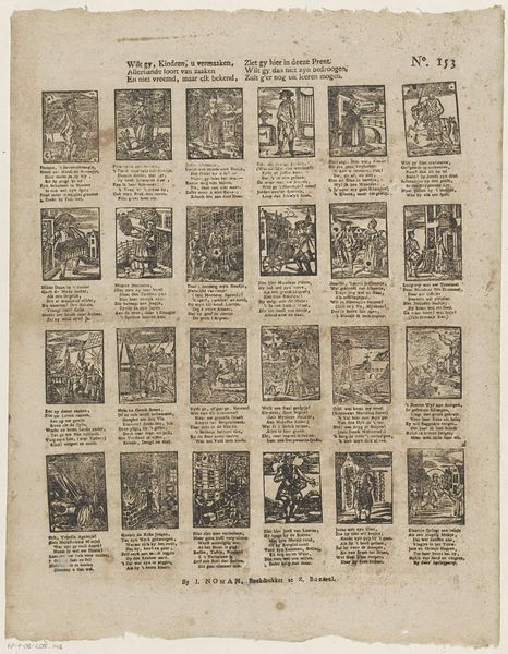 Editor: So, this print from the Rijksmuseum is called "'t Is om uw zinnen te vermaaken, / Dat men, o lieve jeugd! u biedt [(...)]", made sometime between 1806 and 1830 by Johan Noman. It's an etching, a sort of densely packed page of little scenes. It kind of feels like looking at a historical meme. What do you make of all this, conceptually and visually? Curator: Oh, it’s absolutely a meme! You’ve hit on something there. Look at the sheer density, like one of those ‘visual encyclopedias’ meant to both educate and entertain. The phrases "o lieve jeugd!" suggests a definite moral undercurrent, doesn’t it? Almost a catalogue of life's little dramas presented for youthful consideration... with some rhyme, even, how delightful! Do you see echoes of older emblem books in its layout? Editor: I do now that you mention it! It’s like a precursor. Each little image trying to impart some sort of…wisdom? Is that what you’re picking up on? Curator: Indeed, wisdom but also amusement, hence "om uw zinnen te vermaaken"! It’s a whole early social media feed compacted onto one page, with equal measure didacticism, comedy, observation! Think of the viewers it may have captivated at the time, maybe prompting giggles in a dim light, what stories did these vignettes whisper? Editor: Wow, that really puts it into perspective. I was stuck on "old," but you've shown me how fresh and relevant this actually is. Thanks! Curator: The past is so good at seeming relevant! Makes me tingle with potentiality and stories... Always.