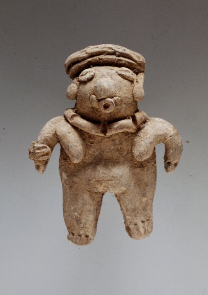Editor: Here we have "Standing Figure," a ceramic sculpture from the Chupícuaro culture, dating roughly to 250-300 CE. The figure is small and seems so grounded, solid. How might we interpret this work? Curator: Its stillness carries weight, doesn’t it? Consider how seemingly simple forms accumulate meaning over centuries. Earthenware links this figure materially to the earth itself, speaking to cycles of life. And what about that striking headdress or hairstyle? Do those patterned shapes suggest something to you? Editor: Maybe status or ritual adornment? It does feel very intentional, those raised circular forms. Curator: Precisely! Headwear is powerful symbol. Think, too, of the figure's simplified, almost childlike features, the wide eyes and subtly open mouth. Indigenous American art often uses such stylization. What emotions are evoked by the form? Is there an openness, vulnerability even, in its presentation? Editor: Definitely a sense of directness, an openness. Almost like an invitation. And being small-scale, ceramic means it was probably very tactile at some point. Curator: The connection is physical and emotional, crossing generations. The survival of these materials speaks to its significance. Such figures acted as cultural touchstones. Does that impact your reading of it? Editor: Absolutely. The idea of it being held, handled, cherished... it shifts my perspective. Thanks, I'm looking at it totally differently now! Curator: It’s amazing how even fragments can carry so much symbolic resonance. Every viewing unearths new layers, and every reading echoes its timeless message.