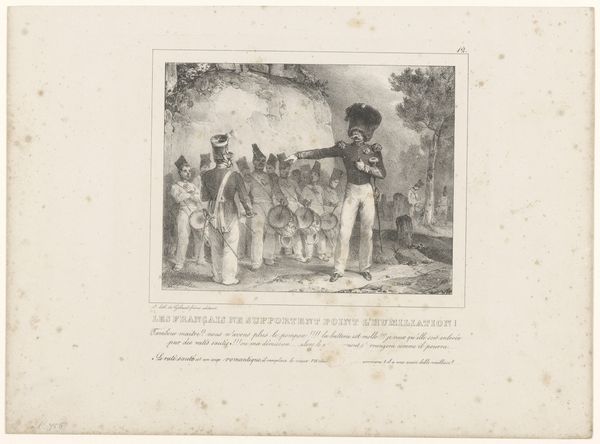 Editor: Here we have Paul Gavarni's lithograph from 1838, "Young Man Arrested by a Patrol of the National Guard." The chaotic cross-hatching gives a frenetic energy to the scene, a real sense of drama. What formal qualities stand out to you? Curator: The lithograph presents a compelling study in contrasts. Note the rigid, almost geometric forms of the soldiers' hats and the severe lines of their rifles. These are juxtaposed against the more fluid and rounded figure of the young man. How does that formal contrast speak to the larger narrative? Editor: It highlights the power dynamic, right? The rigid lines represent order and authority, while the young man's curves suggest vulnerability and perhaps even resistance, despite being restrained. But I'm interested in the repeated use of line—hatching and cross-hatching give it this bustling effect. What does it do? Curator: Precisely. Gavarni’s mastery of line is paramount. The density of the lines creates areas of deep shadow, particularly around the figures, effectively compressing the pictorial space and heightening the sense of immediacy. But consider the areas of relative lightness: they guide the eye, emphasizing certain details. Editor: So, the lighter areas draw us to key narrative details? The young man’s face, for example. I also see how the artist contrasts light and dark to almost sculpt the figures with stark shadows, lending a sense of drama and immediacy to the print. It's more than just illustration; it’s commentary through form. Curator: Precisely. It is the careful modulation of tonal values, the calculated distribution of visual weight that truly elevates the print. I think Gavarni creates commentary on power and oppression not merely through subject, but, cleverly, through design. What did you think? Editor: This really shed light on Gavarni’s formal skill – seeing the commentary embedded within the composition itself. It certainly has offered me an enriching understanding.