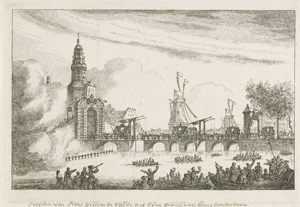 Editor: This etching is titled "Procession of the Rokin with the Theater on the Island at Right" by Salomon Savery. I'm struck by the intricate detail and how the linear quality creates a sense of movement. What can you tell me about this piece? Curator: Observe how Savery orchestrates a complex composition using line. The eye is guided across the water by the repetition of boat forms, each meticulously rendered, culminating at the architectural mass on the right. Note the interplay between light and shadow, achieved through varied line density, and how it defines spatial relationships. Editor: It's fascinating how the lines create depth. It almost feels like a choreographed dance. Thanks! Curator: Indeed. By focusing on the formal elements, we gain insight into Savery's technique and the visual dynamics at play.