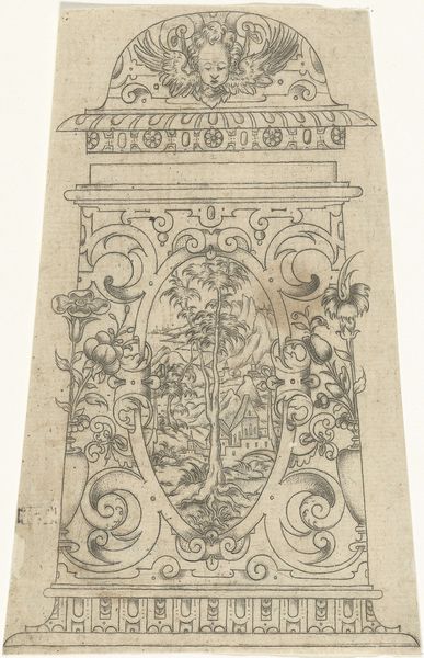 Curator: Right now, we're standing in front of a 17th-century engraving currently held at the Rijksmuseum. It's titled "Beker, met in het midden een ovaal met een landschap," which translates to "Beaker, with an oval containing a landscape in the middle.” Editor: My first thought is "exquisite," like an antique lace pattern captured in light and shadow. The fine detail—the way the landscape is nestled within all that swirling ornamentation—it feels so intimate. Curator: The image presents a detailed landscape scene contained within an ornate oval frame, meant to represent a beaker or goblet. These types of decorative prints were quite common. They weren’t necessarily designed to be displayed as artworks themselves. Instead, prints like this often served as design templates for artisans, goldsmiths or glassmakers who were looking for inspiration. Editor: So, imagine someone taking this image and meticulously etching it onto a delicate glass goblet. It's design-ception! You've got the landscape *within* the depicted beaker... So meta for the 1600s. I’m curious: Were these designs really used, and can we see evidence of similar patterns from that period on surviving objects? Curator: Yes, archaeological and museum collections contain abundant evidence of pattern-following in material culture and ornamental vocabulary. We see versions of such designs in ceramics, metalwork, even textiles across the Dutch Republic and beyond. What this print lacks in color, it more than makes up for in line work. Note the variety of patterns filling the negative space. Consider the social function too; by disseminating such prints, an entire class of artisans and eventually consumers became participants in a broader aesthetic discourse. Editor: Thinking of aesthetic discourses, even today, I can imagine endless takes on this design popping up in tattoos. Speaking personally, I find the two cherubs peeking out on the top add a certain cheekiness to the composition. It feels like they're in on some joke, looking down at the serious landscape below. A fun juxtaposition of the sacred and the ornamental. Curator: True enough, and seeing it through your perspective is a welcome breath of fresh air in evaluating early modern imagery. Editor: Well, I am glad to provide. Art really invites you to linger in your imagination if you grant it time and patience. Thanks for all the history!