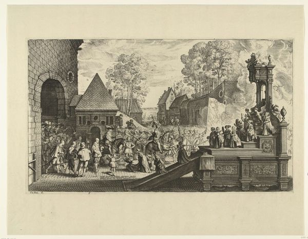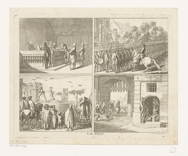 Curator: This is "Huwelijksplechtigheid en begrafenis in Japan", or "Marriage Ceremony and Funeral in Japan," an engraving made in 1727 by Bernard Picart. It’s quite a detailed piece. The composition, split horizontally, depicts what the artist imagines a wedding and funeral in Japan would be like. It's fascinating to see this historical interpretation, though it’s probably inaccurate. What strikes you first about this work? Editor: It’s the stark contrast between the top and bottom halves, isn’t it? The ‘marriage’ scene feels strangely chaotic with all the activity and burning pyre and then underneath there's a darker procession for a funeral. What visual techniques does Picart use to distinguish these events and guide our eye? Curator: Observe how Picart employs linear perspective to create depth in both scenes. The repetition of figures, arranged in a structured receding pattern, provides a sense of order within the perceived chaos. Note the distinct framing, creating almost a sense of "tableaux" and further segmenting it. What compositional rhythms can you identify? Editor: The figures seem stiff, almost posed, despite the busy scenes they inhabit. It’s like he is using repetition to describe cultural ritual, but it doesn’t come across as authentic. It also flattens space in an interesting way... Curator: Indeed, Picart likely relied on secondhand accounts and his own imagination. His intent might be to emphasize perceived differences between cultures, and observe. Is there anything particularly interesting you are observing? Editor: It’s the lines. The precision of the engraved lines define every detail, from clothing to architectural elements. Curator: Exactly, this creates a striking clarity that draws the eye into the scene, though possibly obscuring genuine emotional nuance. By emphasizing detail and clear spatial organisation he elevates cultural documentation into high art in his eyes. It’s a window into his formal aesthetic choices, irrespective of what is necessarily truthful about Japan. Editor: So, focusing on the form illuminates Picart’s vision and style, regardless of the actual content? It gives us insight into European perspective on "exotic" practices. Curator: Precisely! It teaches us as much about the artist's world view as it does about Japanese culture of the time. I appreciate how a close reading lets us to find multiple ideas that can be had through this one piece of art. Editor: This engraving certainly offers layers beyond a simple depiction of ceremonies. It encourages a much wider perspective on the artwork's value!