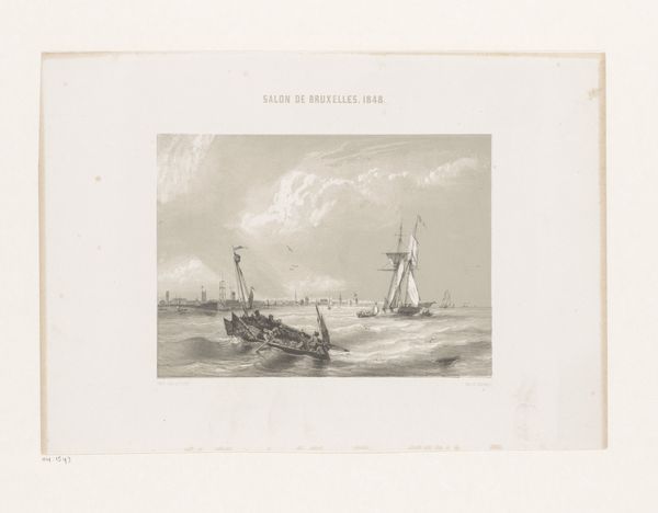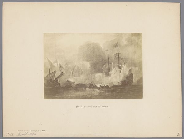 Curator: This watercolor, entitled "Vaartuig, 11e eeuw" or "Vessel, 11th Century", was completed by Willem Jacob Hofdijk between 1857 and 1864 and currently resides here at the Rijksmuseum. It certainly evokes the spirit of romanticism! Editor: My first impression is the relentless churn of the sea against the vulnerability of these vessels. It really feels as if the waves themselves are monumental beings, indifferent to the fate of those aboard. Curator: Hofdijk certainly chose a subject ripe with possibilities. In the mid-19th century, there was growing interest in national identity and historical narratives, often seen through a romantic lens. Depicting vessels of the 11th century, even if imagined, tied into this growing nationalist sentiment, suggesting a shared, perhaps idealized, ancestry. Editor: And observe the symbolism. Ships, of course, are powerful symbols of journeys, both physical and spiritual. Given the supposed era, do you see any reference to Norse mythology perhaps? Curator: That’s an astute question. Given the burgeoning field of historical studies and folklore in the mid-19th century, it's possible Hofdijk, even unconsciously, included elements that reflected popular conceptions of the Viking age. Yet the imagery of Norse symbolism may not have yet entered mainstream artistic language, as Viking iconography and sagas became increasingly popularized only a bit later in that century. So here the "historical accuracy" reflects more contemporary ideas about history rather than that of the 11th century itself. Editor: It does lend itself to the broader narrative, of course. I can't help but note the vessel appears caught mid-surge, that lone figure atop is really evoking feelings of danger but also perhaps defiant spirit! Curator: The tension here mirrors social and political sentiments of the time, perhaps suggesting how individuals and nations confront challenging conditions and carve their paths through rough waters. Editor: Examining these images is so compelling precisely because we can see those emotional continuities echoing across time and visual language, isn’t it? Curator: Yes, and even the medium itself, the watercolor, with its delicate and translucent nature, softens the harsh reality of life at sea, allowing the viewer to reflect on historical narratives in a way that isn’t entirely defined by battles and conquest.