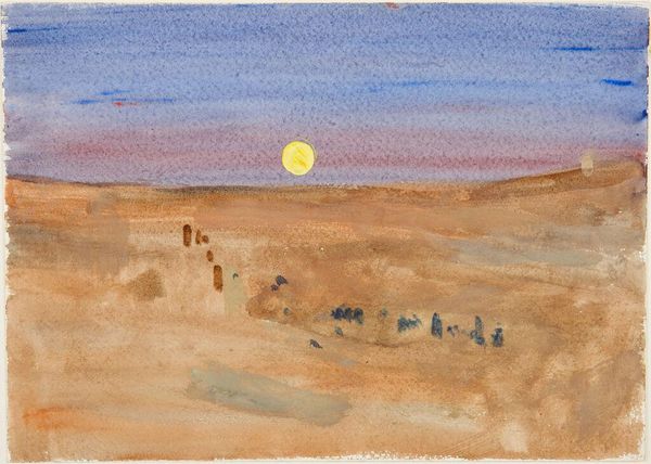 Curator: This is Denman Waldo Ross’s watercolor, “Moonrise on the Desert, Assouan, Egypt.” Editor: It’s so serene! The soft washes create an ethereal landscape. Curator: Ross’s technique involves layering thin washes of watercolor, emphasizing light and atmosphere. He was quite interested in pigment application. Editor: The lone structure atop the dune—what do you make of its historical and social context? It certainly evokes feelings of isolation. Curator: The building could be a watchtower or a tomb. Editor: Possibly. And one could easily read it as a symbol of power, both human and natural, set against the backdrop of colonial Egypt. Curator: Perhaps. I’m mostly struck by how Ross rendered the landscape, reducing it to simple shapes and colors, emphasizing the flatness of the paper surface. Editor: The painting gives us so much to consider in terms of place and cultural identity. Curator: Indeed. It’s a small work, but one that makes us ask important questions.