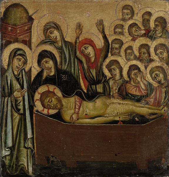 Editor: This is "Assumption (Fragment)" by Duccio, dating back to 1311. It's a tempera painting, and what strikes me first is the emotional intensity, even in this small section. The faces are so expressive. What do you see in this fragment that really grabs your attention? Curator: Oh, absolutely! It’s more than just a fragment, it’s a peephole into another world, isn't it? The Sienese School aesthetic just oozes devotion, but with a grounded humanness I adore. The gold leaf screams heavenly, and the cobalt blue of Mary's cloak—the most expensive pigment then—positively vibrates! And then you notice how Jesus holds…is that a baby? Is this a symbol of something or a little artistic detour to represent the salvation of his mother and queen? Editor: I was wondering about that baby. So you're saying that beyond the obvious religious symbolism, Duccio's using color and composition to really amplify the scene's importance? Curator: Exactly! That blue doesn’t just exist. It signifies something! Remember, art in this period wasn’t just decoration. Everything, even down to the tilt of a head, had meaning layered upon meaning. And Duccio does it with such heart, such tender observation! Does that change how you perceive it a bit? Editor: It really does. I was focused on the emotion, but now I see how every element is carefully chosen to enhance that emotional impact. The colors, the materials… it’s all deliberate. Curator: Yes! Isn't it fantastic? It’s a reminder that even fragments can contain entire universes of intention and beauty. Something to remember for your own work, perhaps? Editor: Definitely something to remember. Thanks, that really opened it up for me.