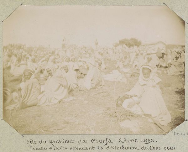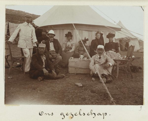 Editor: This albumen print, possibly from 1895, titled "Company in front of a tent on the occasion of a wedding in Berrouaghia (Algeria), including persons named 'M. Graëchen' and 'Abbas Abdallah ben Hassen Khajda'", appears to document a specific event. What strikes me is the contrast between the group in European military dress and the Algerian wedding party. What symbols or visual cues do you notice in this photograph? Curator: The tent itself, of course, becomes a crucial symbol. Throughout history and across cultures, the tent represents both shelter and transience, the domestic and the nomadic. Consider how its presence here intersects with the colonial narrative suggested by the French military uniforms. Editor: So the tent creates a sort of symbolic meeting place? Curator: Precisely. It's a threshold. Observe the attire: The wedding party is draped in light, flowing garments. The European figures, in their darker, more rigid uniforms, seem to impose a different kind of order. Notice how they are positioned. Is there a hierarchy suggested? Editor: It does seem that the Europeans are more central within the composition. Curator: The arrangement might signify the power dynamics at play. Light versus dark, flowing versus structured, indigenous custom versus colonial influence— these visual symbols coalesce into a complex statement. What feelings does that color evoke for you? Editor: It brings up conflicting ideas. The scene feels celebratory because of the wedding, but there's a definite undercurrent of tension created by that opposition you pointed out. I never would have considered that before! Curator: Exactly! Understanding the cultural memory embedded within symbols allows us to read the past with greater nuance. Hopefully we can all continue this interpretation.