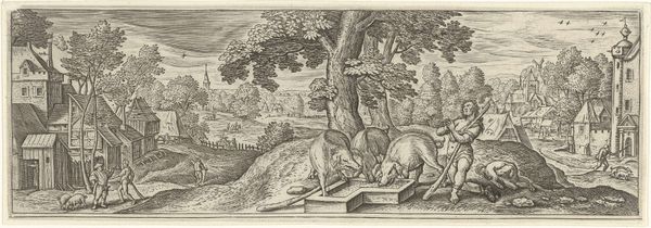 This is 'Blad met diverse diersoorten', an etching made by Jan Caspar Philips in the 18th century. The landscape scene is meticulously composed with animals placed across the foreground. The animals, each carefully rendered, are set against a backdrop that recedes into the distance, indicated by the varying line density used to create texture. This provides a sense of depth, though somewhat flattened. Philips’ rigorous approach to form is evident in the detailed rendering of each creature, from the scaly hide of the crocodile to the feathered body of the large bird, each meticulously described with delicate line work. The structured composition, in which each animal is carefully placed, mirrors the broader Enlightenment project of cataloging and understanding the natural world. Philips invites us to not only observe but also to classify and comprehend, underscoring the era’s quest for rational order and scientific knowledge.