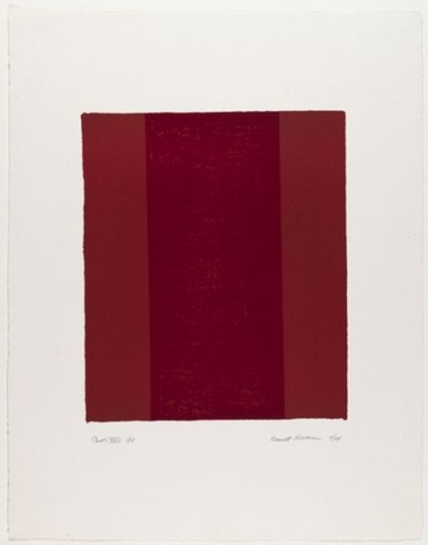 Editor: This is Barnett Newman's "Canto XVIII", part of his series of prints, and I’m struck by how these vertical bands of red create such a powerful, almost confrontational statement. What do you see in this piece? Curator: I see Newman grappling with the legacy of abstraction, moving beyond formal concerns to engage with existential and political questions. Considering the socio-political context of the mid-20th century, does this seemingly simple composition speak to larger themes of division, unity, or perhaps even trauma? Editor: Trauma? I hadn't considered that. I was mostly focused on the color. Curator: Color is crucial, but think about the "zip," the vertical line. How does it interrupt or redefine the space around it? It's not just about aesthetics; it's about disrupting the status quo. Editor: It’s interesting how much history and theory can be packed into something that seems so minimalist. Curator: Exactly. Art is never created in a vacuum. Understanding the context is key to unlocking its deeper meanings.