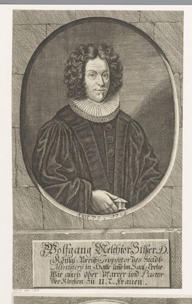Georg Daniel Heumann created this portrait of Thomas Beck using engraving, a process of incising an image onto a metal plate, and the result is an image full of linear precision. The composition divides into distinct zones. The foreground features the subject, Thomas Beck, with his book. Behind him, a crucifix and bookcase add layers to the space. The linear quality of the engraving technique is particularly noticeable. Heumann uses dense, fine lines to create shading and texture, giving the image a rich visual depth. Note the subject's costume, every fold and texture delineated to emphasize volume and form. The background, with its rows of books, is carefully rendered, yet less defined, placing the figure of Beck in sharp relief. Consider how Heumann's linear language functions. It’s not merely descriptive but deeply structural, dividing the image into distinct fields of information. This portrait operates as a visual and textual discourse, inviting us to interpret Beck’s identity through carefully constructed visual cues.