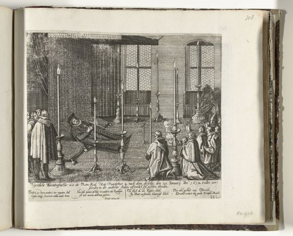 Editor: This is "Kraamkamer van de apen," or "Apes’ Lying-in Room," an engraving by Matthijs Pool from around 1720. The scene is bizarre – monkeys dressed in human clothes attending to a newborn monkey! It’s rendered with such fine detail using the engraving technique. It almost feels like a commentary on human society. What strikes you about this piece? Curator: The power of this work lies in its formal construction. Note the organization of the composition: the clear separation of planes, creating a shallow space reminiscent of a stage. Consider, too, the deliberate contrast between the density of lines used to render textures and the relative openness of the background. Are you sensing how these contrasts create focal points? Editor: I am, now that you mention it. The areas with a lot of hatching draw my eye, like the fire and the textures on their clothes. But it feels like more than just directing the eye. Curator: Indeed. Let us consider how the stark contrasts might signify more than surface appearance. Note the implied texture in the monkey's attire. Think about what it means to mimic fabric so carefully, but rendered in ink. Ask yourself how that affects the overall reading of the print, beyond its representational qualities. Editor: So it’s not just *what* is depicted but *how* it’s depicted that gives the work its strength. The sharp lines of the engraving versus the soft textures they're trying to represent add another layer of meaning. Curator: Precisely. Pool manipulates these elements to push us to consider the nature of representation itself, does he not? Editor: I hadn't considered it that way before. Looking at the technique alongside the subject matter gives it a whole new level of complexity. Curator: Indeed. It moves us beyond simple narrative into a commentary on artistic practice itself.