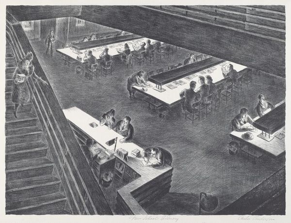Editor: We're looking at William Wolfson's "Auto Factory," created in 1944. It appears to be a print, maybe a lithograph or some kind of drawing. The way the scene recedes into the background is incredible. What do you see in this piece in terms of composition? Curator: I'm struck by the strong diagonal lines that dominate the composition, creating a powerful sense of depth and perspective. Notice how Wolfson uses these lines, emanating from the lower left, to guide the eye through the ordered chaos of the factory floor. The repetition of geometric forms—the cars, the machinery, even the workers' stances—introduces a visual rhythm. How does this geometry impact the overall feeling of the piece, do you think? Editor: It almost makes the workers seem like part of the machine, but I find a certain beauty in its functional elegance. The crisp lines of the cars and equipment evoke the clean lines of modernist architecture. Curator: Precisely. Note the contrast between the sharp lines defining the machinery and the softer shading used to render the human figures. This suggests a hierarchy, where the technological apparatus takes precedence. Consider, too, the spatial relationships: the factory floor stretches out, seemingly infinite. Editor: That almost sterile feeling juxtaposed with the figures. There is not a focal point so the viewer sees all the factory activity at once. Do you see any interplay between the form and content of this image? Curator: Certainly. The meticulously rendered forms communicate a sense of order, control, and, perhaps, the relentless march of industrial progress. There's a definite aesthetic being proposed here. How would you describe that aesthetic and the meaning created by that design? Editor: It creates a sort of mechanized vision with great use of lines and shapes to create depth, and it also reveals that man and machines are both responsible in building industry. It is almost optimistic despite the repetition and starkness. Thank you, this close look has brought up many interesting angles about mass production. Curator: It's the synthesis of line, form, and spatial arrangement that allows Wolfson to transcend a mere representation of a factory and offer a meditation on the very nature of industrial production. A satisfyingly self-contained world created from geometric interplay.