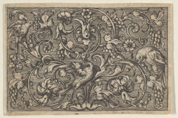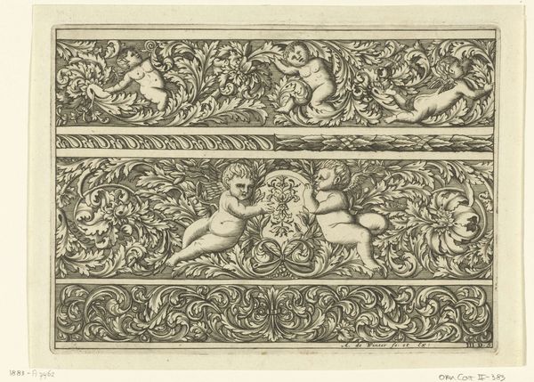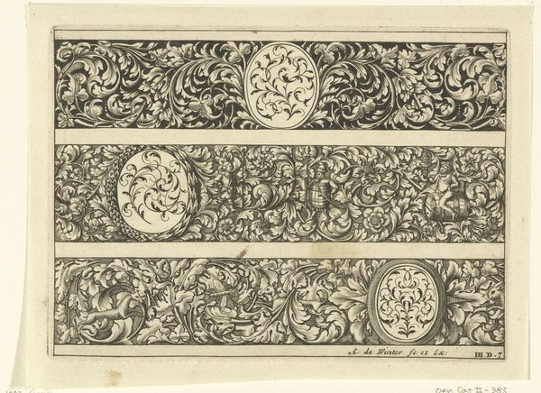 Editor: This piece, “Drie friezen met bladranken” or “Three Friezes with Foliage,” was created around 1696 by Anthonie de Winter, using engraving techniques. It's incredibly detailed; the patterns are so dense. I'm struck by the stark contrast of light and dark. How do you interpret this work? Curator: Primarily, I observe a mastery of line. Consider how the varying thickness and density of the engraved lines construct form, texture, and depth, all without recourse to color. Note the formal arrangement: three distinct horizontal registers, each containing variations on the theme of vegetal ornamentation, punctuated by human figures. The interplay of organic and figurative elements contributes to the work's dynamic tension. Do you see how the foliate scrolls both contain and release the figures? Editor: Yes, I see what you mean. The figures seem almost trapped within the foliage in some areas and freely floating in others. It’s interesting how the artist created this effect simply with lines. Curator: Precisely. Furthermore, attend to the systematic repetition and variation. Observe how individual motifs, such as the acanthus leaf, are subtly transformed and recombined across the three registers. This creates both a sense of unity and a pleasing visual rhythm. It speaks to the engraver's facility with pattern making and geometric structures that ground the artpiece. Editor: I see, now that you point that out, how the repetitions work with the baroque style! Thank you. This deeper visual exploration helps to better understand the intent of de Winter. Curator: A close inspection and attention to form reveals that which is at its essence.