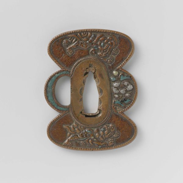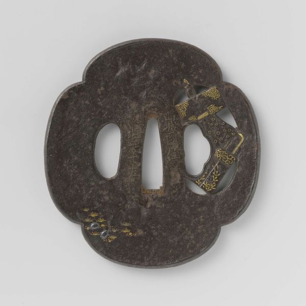 Curator: It looks like time, and maybe some battles, have definitely left their mark! Editor: Indeed. What we’re looking at here is a hand guard, dating from somewhere between 1600 and 1900. Crafted from metal, it’s a striking example of decorative art, a piece born from a very specific craft and context. Curator: There’s such a quiet beauty to it. You know, beyond its utilitarian purpose. Holding it, you can almost feel the weight of history. Not just war, but also the rituals surrounding it. Editor: Exactly! Think of the smith who labored over this piece, forging the metal, meticulously shaping it, maybe even imbuing it with symbolic meaning for the warrior who would wield it. This object speaks to skill, material, and ultimately protection and labor, not only beauty. Curator: I love that tension though, the artistry intertwined with pure functionality. That dark, aged patina practically whispers of smoky forges, of skilled hands shaping metal with fire and hammer. It becomes something much greater than its function, something reverential and precious, almost. I can’t help but ponder on the idea of resilience and vulnerability. This unassuming disk protected a warrior's hand but couldn’t, perhaps, guard against emotional wounds. It feels deeply human. Editor: And considering the social hierarchy surrounding the warrior class at that time, we have to ask—who truly benefited from the craft? How did labor intersect with power, class, and even trade? Even within decorative art, a lot of labor is used to mask unequal social conditions, which ultimately makes something simple as an object like a tsuba quite a complicated signifier of human relationships. Curator: I find myself feeling the echo of forgotten lives lived in its presence. What a reminder that even the most humble object can be a vessel brimming with meaning. Editor: Agreed. And that simple forms belie layers of stories concerning both craftsmanship and societal structures. A tsuba indeed holds an unexpected complexity.
