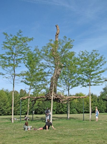 Roxy Paine’s “Graft” is a massive sculpture of a tree, reaching almost 45 feet into the air. It's built from stainless steel, and when you first see it, the cool gray color palette might feel a bit distant, a little cold. But stick with it. What interests me is the way Paine builds up this thing, piece by piece. Look at how the branches twist and turn, seemingly at random, like a drawing in space. There is this kind of making that is a slow, steady, iterative process, which is kind of lovely. You can see the joins, the welds, where one piece of metal meets another. They're not trying to hide the work, but showing you how the tree came together. The way the light catches and reflects off the steel gives it an almost ethereal quality. It makes me think of other artists who use industrial materials in organic ways, like Eva Hesse. Like her work, Roxy Paine’s Graft reminds us that art can be both beautiful and a little bit unsettling, and that there’s always more than one way to see the world.