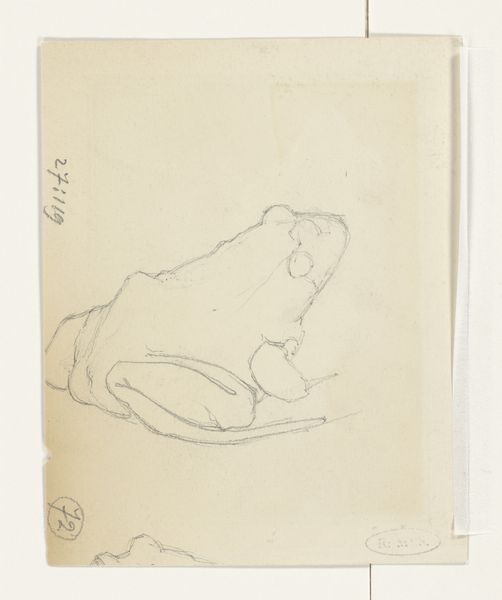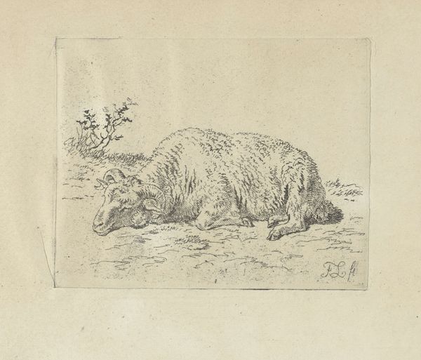 Curator: This delicate sketch captures a sheep at rest, entitled "Liggend schaap", which roughly translates to "Lying Sheep." It’s attributed to Alphonse Stengelin and thought to have been created sometime between 1862 and 1938, crafted using pencil on paper. Editor: My first impression is the utter stillness of the scene. There’s an almost melancholic weight to it, a quiet commentary on rural life captured in spare pencil strokes. Curator: Indeed. The artist’s choice of humble materials reflects a direct connection to the subject matter, stripping away any pretension. It really begs the question: what conditions shape our ideas of artistic value? Are we too often focused on grandiose scale, expensive materials? Here, we have a humble drawing of humble animal! Editor: Precisely! And Stengelin presented this at a time when rural communities and their associated industries were being reshaped, and in some instances displaced, by increasing industrialisation. This work, perhaps unintentionally, valorizes agrarian life. What role did art play then, and what role does it play now in influencing or reflecting major historical movements? Curator: I am drawn to the application of pencil on paper - so seemingly straightforward, yet rendered in such an observant way. It's interesting to me, too, how this sort of representational landscape becomes part of constructing "landscape" itself - it invites a reflection on what landscapes do, and have done, for particular economic interests and purposes. And how drawings such as these facilitate this! Editor: You know, looking at the piece I wonder where was this exhibited? And by whom was it collected and preserved? It asks larger questions: What institutional narratives were promoted when it was made, and which survive now? Curator: Examining this Stengelin work certainly forces us to contemplate both artistic expression, material and cultural contexts of artistic labor. Editor: Absolutely, and it reminds us to critically consider what stories art can reveal if we’re willing to examine its path through history.