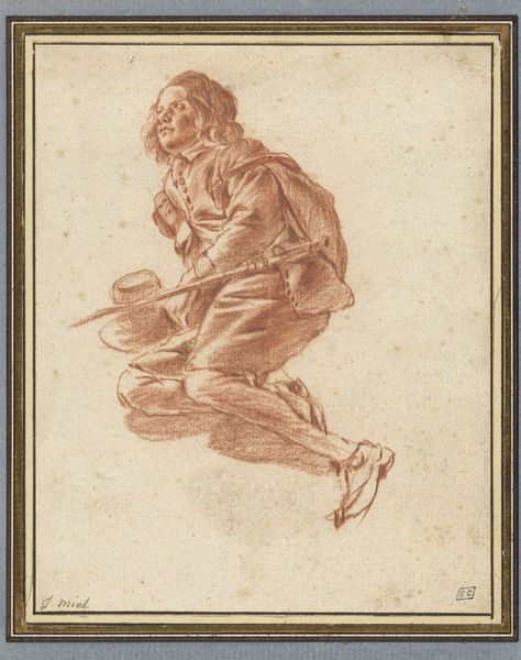 Jan Miel created this drawing of a young rider around the 17th century, using red chalk on paper. The sketch presents a figure in dynamic imbalance. Miel's technique focuses on contour and rapid strokes to define form. The rider's posture, with one leg extended, suggests movement, yet he remains suspended in the composition. The use of hatching and cross-hatching adds depth and volume, accentuating the folds of the clothing and the roundness of the limbs. The drawing destabilizes conventional portraiture by capturing a fleeting moment. The unfinished quality emphasizes process over product, inviting the viewer to complete the narrative. This approach aligns with a broader artistic interest in the provisional and the potential inherent in unfinished forms. The rider's ambiguous position challenges fixed meanings. Is he about to mount or dismount? This uncertainty reflects the Baroque period’s fascination with dynamism and the transient nature of human experience.