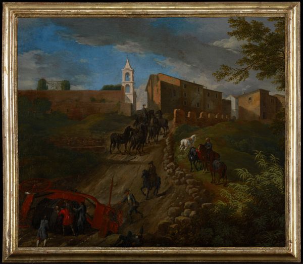 Heinrich Bürkel painted ‘Cattle Watering at a Fountain on the Via Appia Antiqua, the Ruins of An Aqueduct in the Background’. Note the striking contrast between the ancient ruins and the contemporary figures. Bürkel’s composition relies on the interplay between horizontal and vertical elements. The Via Appia, with its paving stones extending into the distance, establishes a strong horizontal base, while the aqueduct ruins punctuate the skyline with their vertical presence. The muted tones of the landscape—browns, grays, and subdued greens—create a sense of timelessness, almost elegiac. The herd of cattle and the herdsmen introduce movement and life, disrupting the stillness of the ruins. Semiotically, the ruins represent a bygone era of architectural and engineering prowess, while the cattle symbolize nature's continuous presence and renewal. The fountain acts as a meeting point between these two worlds, where the old provides sustenance for the new. Notice how the light filters through the scene, casting shadows that accentuate the textures of the stone and the dust kicked up by the cattle, further blurring the boundaries between past and present. Bürkel invites us to reflect on the cyclical nature of history.