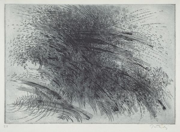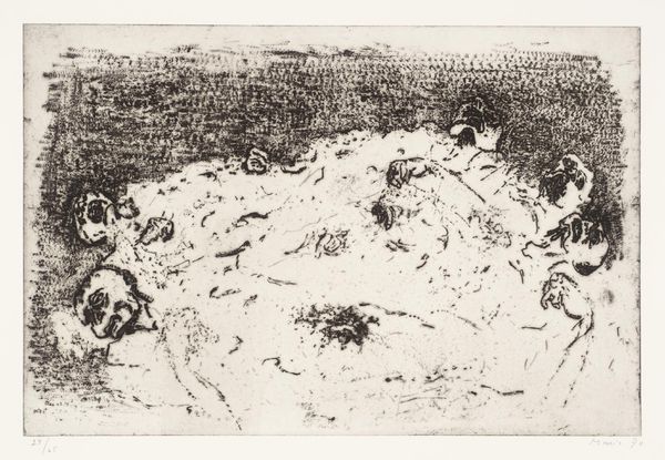 Editor: The work before us, "We Are Not the Last," is by Zoran Music. It is held in the Tate Collections. Curator: The stark composition immediately evokes a sense of profound desolation, wouldn't you agree? The monochrome palette amplifies the unsettling stillness of the scene. Editor: Indeed. This print reveals Music's engagement with etching. The materiality speaks volumes—the biting of the acid, the wiping of the plate. One can almost feel the labor and the directness of the process in conveying such a heavy subject. Curator: The arrangement of figures creates a disturbing yet compelling rhythm. The negative space and the clustering of marks lead the eye to consider the underlying structure. Editor: I think about the historical context. Music, a survivor of Dachau, used the print medium to grapple with trauma and create an enduring testament. The availability of printmaking democratized his message. Curator: Precisely. And through the work’s stark visual language, the artist has transcended the personal to evoke something universally resonant about loss. Editor: It's a testament to the power of art, isn't it? Transforming experiences into something tangible and enduring.