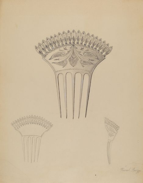 Curator: This is a watercolor and drawing entitled "Comb" by Tulita Westfall, dating circa 1937. Editor: Immediately, I see an object suspended in quiet space. Its rigid geometry at the base flares upward into these baroque flourishes. A strange juxtaposition, almost a dialogue between function and ostentation. Curator: Hair combs, of course, have existed in almost every culture since prehistory, made from bone, horn, ivory… this rendering points more toward status, the artifice of ornamentation, and a particular social sphere. Editor: Do you mean as emblems of ritual and belief? Because my instinct is toward pure aesthetics, especially that semi-circular corona around its head with the almost Byzantine studded border and elaborate stylized flowers. It has the graphic precision of a commercial print, too, not exactly realism. Curator: Perhaps less belief than belonging. Think about Art Deco’s obsession with luxury liners and machine-age streamlining intersecting with handcrafted indulgence; these hair ornaments in the 30s evoked that moment. It wasn’t just about holding hair in place. It signaled aspiration. These intricate, hand-drawn curlicues carry cultural memories of lavish balls and the carefully constructed performances of femininity. Editor: The color palette reinforces your points – a somber dark brown offset by these glints of bright, hopeful yellow... The artist isolates it, denying any true historical setting or context, thereby encouraging the beholder's projection onto the thing. What did such objects represent for the everyday lives of women? Curator: They were portable stages. Consider Westfall’s choices in depicting this object: the controlled precision of watercolor, that focus on line work. There’s something intensely intimate in the study of this singular item that gestures towards broader social conditions, yet, allows for the quiet dignity of daily adornment. Editor: Agreed. Thinking about these kinds of works as reflections of private routines offers me another perspective. Thank you. Curator: Indeed. It reminds us to seek beyond grand narratives.
