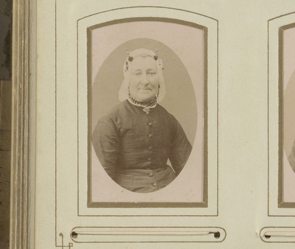 Curator: Here we have an albumen print, a photograph called *Portret van een onbekende vrouw*, or Portrait of an Unknown Woman, dating from between 1879 and 1883. It’s quite small, fitting neatly within a decorated card frame. Editor: It has a slightly ghostly, reserved atmosphere. The woman’s gaze is direct, but her expression is unreadable, shadowed almost. A face from another time, definitely. Curator: Absolutely. The albumen print process, popular in that era, does lend itself to a certain…ethereal quality. It gives these old photographs a characteristic warm brown tone, but often softens the details in the process, giving that romantic haze. It also meant multiples were possible. Think of this object within the context of the rise of portraiture in the late 19th century, the age of social mobility where photographs became ways of presenting yourself and remembering your family. Editor: Yes, I imagine it as a somewhat accessible token, perhaps a reminder for a distant relative or loved one. What fascinates me is her headdress. The style reads to me as distinctly archaic, evoking another period and rural context… like a subtle statement about enduring traditions in a rapidly industrialising world. Curator: You’ve touched upon a crucial element there. These elaborate caps and bonnets were markers of regional identity, especially in rural areas. It was deeply connected to social identity. Editor: The anonymity is compelling, of course, because it renders her a timeless, anonymous, representation, a reminder of past existences. Curator: Indeed. In that way, her anonymity becomes universal. And isn't it beautiful, in a sense, how art enables us to find intimacy even in these fleeting moments captured so long ago. Editor: A small portal to lives both ordinary and profound. I find myself inventing the story that must have filled her life.