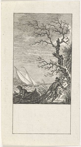 Editor: This print, "Prins Johan Willem Friso verdrinkt bij Moerdijk, 1711" by Simon Fokke, created between 1775 and 1777, depicts a chaotic scene of a capsized carriage and ship amidst crashing waves. It's quite dramatic. What strikes you about the composition of this piece? Curator: Formally, the print presents a dynamic interplay of horizontal and vertical lines. Observe how the diagonal of the overturned carriage and ship confronts the implied verticality of the building in the background, and the billowing clouds above. Do you perceive how this visual tension contributes to the overall sense of unrest and upheaval? Editor: Yes, I see how the diagonals add to the drama. But why focus so much on the lines themselves, rather than what they represent? Curator: The lines aren’t simply representational. Consider the varying density and direction of the etched lines: they evoke a sensory experience of the storm. The closely packed, frenzied lines depicting the waves create a textural effect, communicating the water’s chaotic energy. The sky mirrors that energy but with different visual cadence, wouldn't you agree? Editor: That's an interesting point about the lines themselves creating the feeling of chaos. So, it's less about *what* is being depicted, and more about *how* it’s depicted through the formal elements. Curator: Precisely. And how those formal choices generate meaning. What has changed for you now you considered these elements? Editor: I see how Fokke uses line and composition to build this scene of drowning. Focusing on just these elements, and their visual qualities, really enhances the expressive impact for me. Curator: Indeed, a deeper appreciation of how structure yields content, and perhaps a useful new perspective to bring into your future studies.