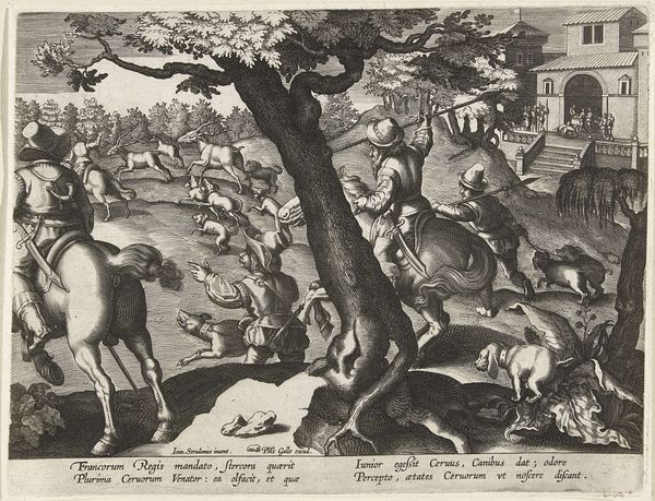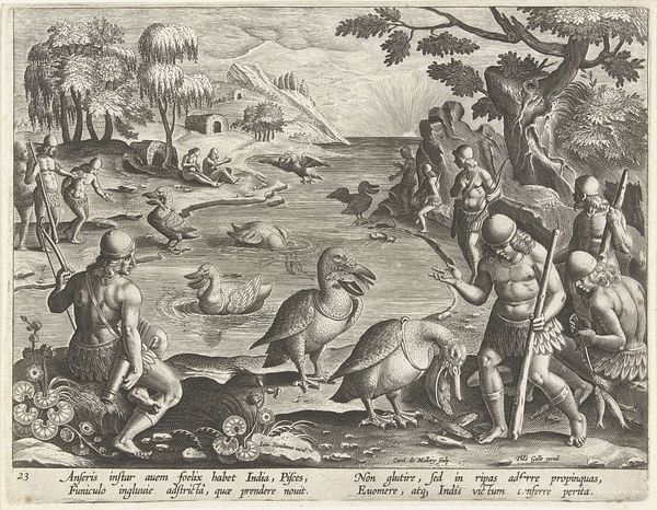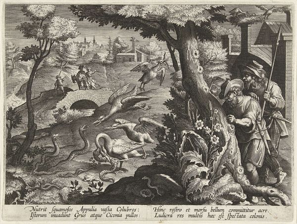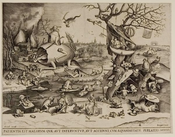 Curator: This print, titled "Geduld," which translates to "Patience," was created in 1557 by Pieter van der Heyden, after a design by Pieter Bruegel the Elder. Look closely—it's an engraving, showcasing the fine lines characteristic of the medium. Editor: It’s striking—grotesque, even. All these figures contorted into strange forms within an unsettling landscape, create an anxious energy. What’s happening here? Curator: The image teems with visual metaphors related to patience, or perhaps the lack thereof. Bruegel often used prints like this to disseminate his artistic ideas widely, turning to skilled printmakers to reproduce his intricate compositions for a larger audience. The engraving technique itself, requiring meticulous labor and precision, embodies patience. Editor: So, beyond the grueling labor involved, what are these creatures really doing? Are these the punishments that come from a lapse in patience, or... Curator: Precisely! Consider the central figure, Patience, who appears almost serene amid the chaos. The landscape behind her represents the world of suffering and temptation. To achieve "Patientia est malorum quæ aut inferuntur aut accidunt, cum aquanimitate perlatio", to ‘bear injuries and misfortunes with equanimity’, is the core principle depicted. Editor: This brings up the role of women at the time too, specifically with the idea that women are to suffer with grace, not engaging or even defending against life's injustices. The composition with the figure of "Patientia" is almost like it reinforces harmful gender expectations! How do we navigate those kinds of uncomfortable observations today, looking back? Curator: It’s important to acknowledge that the visual language of the 16th century was heavily symbolic and laden with moral instruction. The work exists within this historical framework of gender and patience discourse. But by engaging with the uncomfortable aspects, such as your astute interpretation of the woman in the foreground, we foster richer conversations about gender and society. Editor: Understanding that, and really picking through the weeds to see how it all functions is… clarifying, and admittedly, cathartic. I'm left grappling with how even something advocating for inner peace can be rooted in historical anxieties about who bears the burden of such tranquility. Curator: That’s a powerful response and a fine reminder to delve into our assumptions when confronting any artwork, especially one so enmeshed with the socio-political context of its creation.