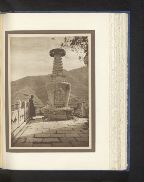 Curator: Standing before us is a gelatin silver print entitled "Unknown Man Overlooking Mountains," attributed to Donald Mennie, taken sometime before 1920. What captures your attention first? Editor: Immediately, a sense of place and manufacture. It is this very controlled interplay of tones rendered meticulously on coated paper, where craft meets cultural depiction. Look at the light catching the textures of that carved stone, but how much labor extracting the minerals and stone it required. Curator: Yes, I find my eye is drawn to the solitary figure. There’s such a pensive quality, the vast mountains amplifying this quiet contemplation. The image speaks to this intersection of the personal and the monumental. Do you feel it too? Editor: Without a doubt. He is framed, almost confined, within this constructed vista; a viewpoint deliberately crafted by human hands, and suggesting an imperial, even exploitative gaze across land understood as both resource and territory. Even the photographer's own materials contribute to this exchange. Curator: I like the way you frame that tension. It brings forth questions of ownership and control—the person against the immensity, the artistry against the raw matter. This is a recurring theme within landscape photography, and particularly compelling here. I am lost, looking. Editor: And it's not simply representational—it’s inherently physical. Silver mined, refined, combined, painstakingly developed; here, it stands, pointing, gesturing towards what we think about man versus nature. Think of this early photo print as more than an "artwork" per se, it becomes about the economy, the labor of photographic print production meeting nature and land, with ourselves, always, implicated. Curator: It is amazing how much it reveals by appearing so simple. Its simplicity contains an entire cosmos of concerns, even still. Editor: Precisely. And it demands we confront it materially as well as aesthetically. To think: photographs such as this changed material culture globally, for photographers and subjects alike! Curator: Indeed, there is nothing to not notice once we’ve started noticing! Thanks for this conversation, full of vista, as always. Editor: Likewise. This image serves not only as document or art object, but a launchpad for continued dialogue of that very sort.
